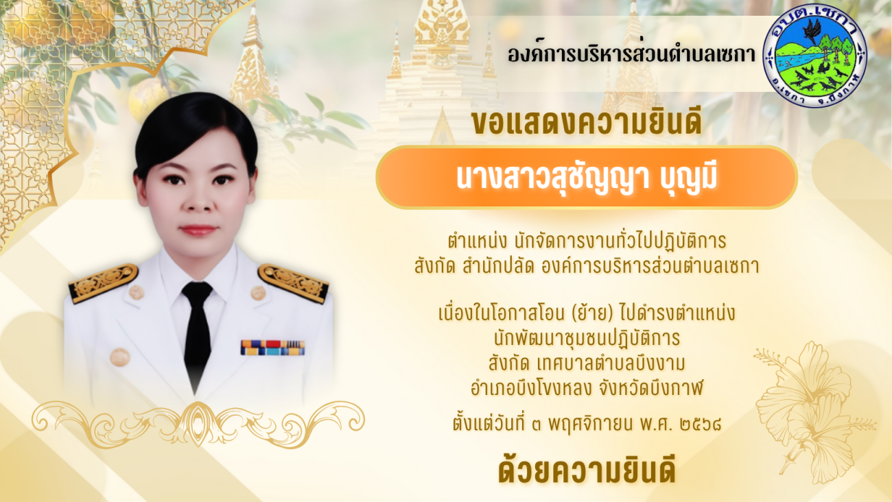 ขอแสดงความยินดีเนื่องในโอกาสโอน(ย้าย)ไปดำรงตำแหน่ง นักพัฒนาชุมชนปฎิบัติการ ของ นางสาวสุชัญญา บุญมี