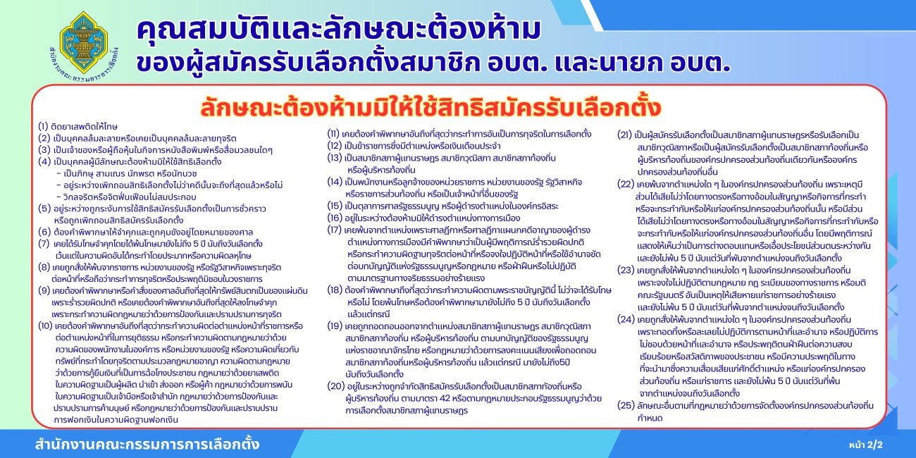 โปรดศึกษาข้อมูลก่อนลงสมัครรับเลือกตั้ง เพื่อความถูกต้องของตัวท่านเองหากสงสัยในคุณสมบัติ และ/หรือ ลักษณะต้องห้าม สามารถติดต่อสอบถามได้ที่